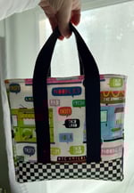 Mini but mighty! This adorable tote has plenty of room for your wallet and cellphone. Measuring 8 inches tall and 9 inches wide. Has handles and interior zipper pocket.
